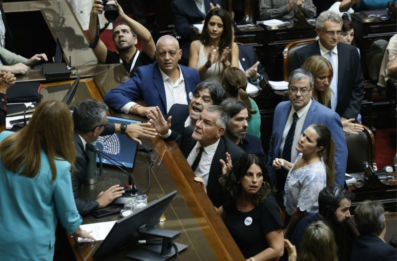 Esa maniobra de Menem desató una batahola de legisladores en su contra. Agustín Rossi, Penacca y Cecilia Moreau se le fueron al humo y parecía que la sesión se le iba de las manos al titular de la Cámara Baja. Incluso, las bancadas de Fuerza Patria, la izquierda y Provincias Unidas empezaron a hacer palmas, a modo de protesta, en medio del griterío.